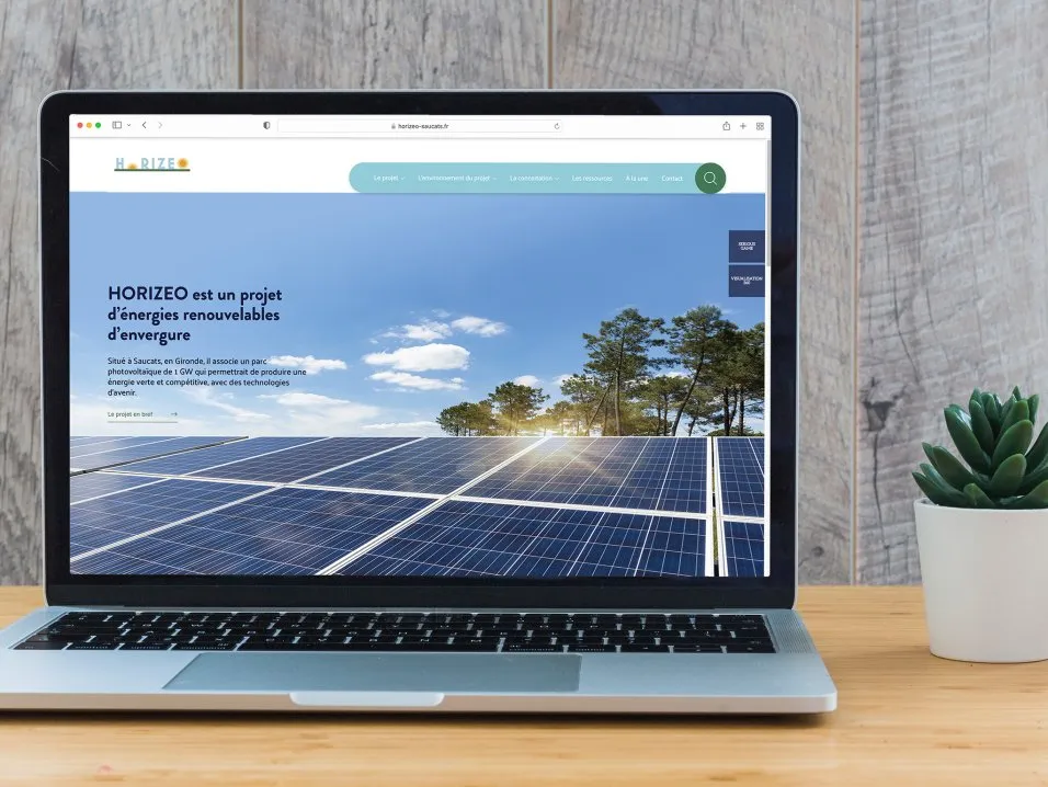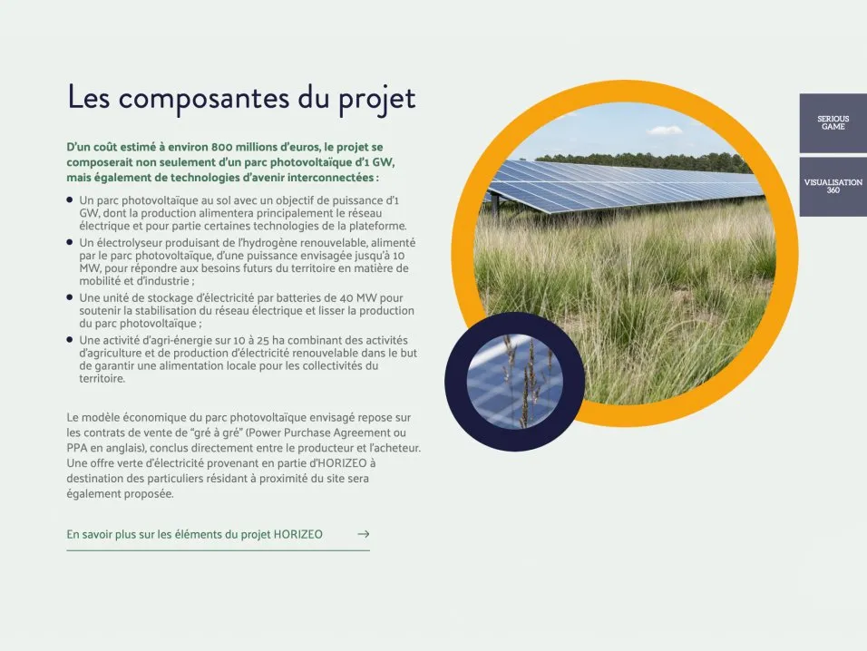 HORIZEO est un projet d’énergies renouvelables d’envergure situé à Saucats en Gironde associant un parc photovoltaïque et des technologies d’avenir. À la suite d’un débat public, les porteurs de projet nous ont confiés la création du site internet. En tant qu’outil de communication principal, le site devait remplir les objectifs suivants : faire connaître le projet HORIZEO, proposer de l’information ludique et accessible, rendre compte de son activité et des études menées.