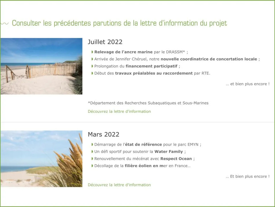 L’enjeu principal était de simplifier et fluidifier l’expérience utilisateur et valoriser les territoires associés aux deux projets de parc Éolien en mer de notre client : Île d’Yeu Noirmoutier et Dieppe Le Tréport.