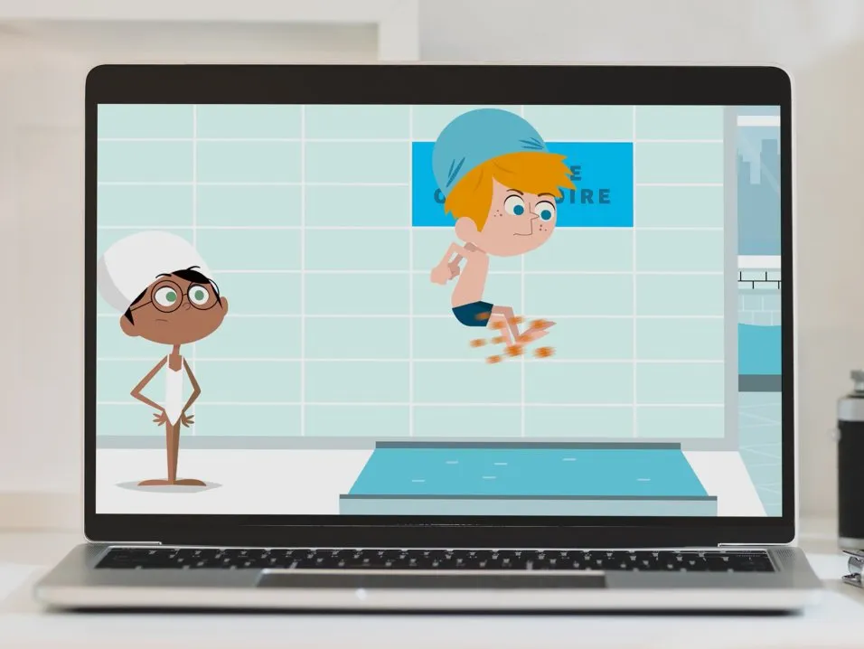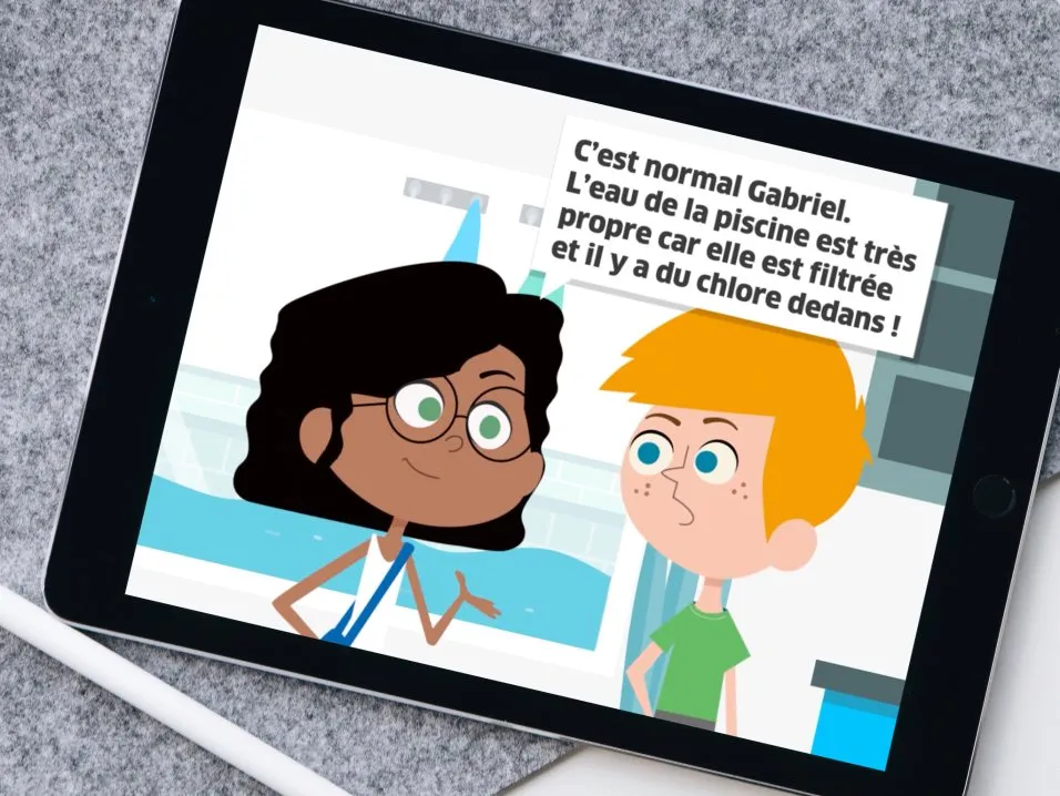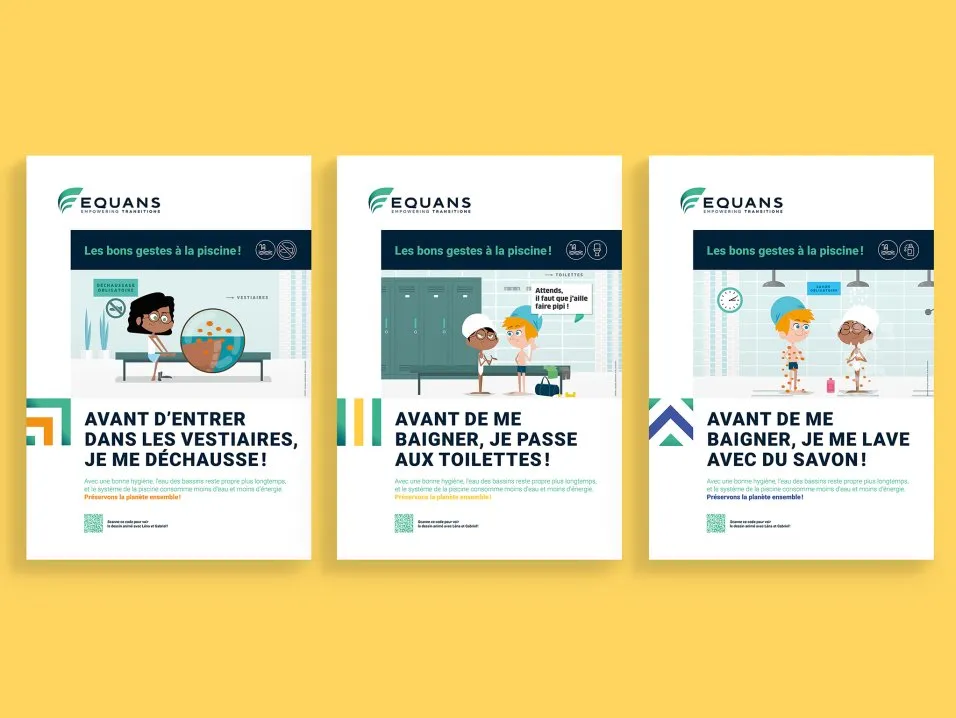 Conçue comme un véritable court-métrage, le dessin animé est diffusé à l’accueil des centres aquatiques clients d’EQUANS. Une série d’affiches a été également créée, rappelant les bons gestes à la piscine.