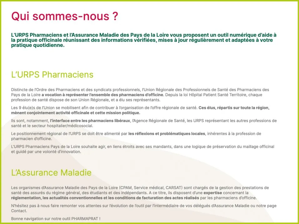 Ces dernières années, les missions des pharmaciens d’officine ont beaucoup évoluées. Pour faire face à ces mutations et dans un contexte d’évolutions fréquentes de la réglementation et des dispositifs, l’Assurance Maladie et l’URPS Pharmaciens Pays de la Loire se sont associés pour créer la première plateforme numérique d’aide à la pratique officinale.